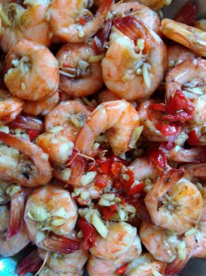 油入锅,放蒜,辣椒,爆炒,倒入虾,同样爆炒,加点生抽。虾变红,加点水,煮一会,起锅