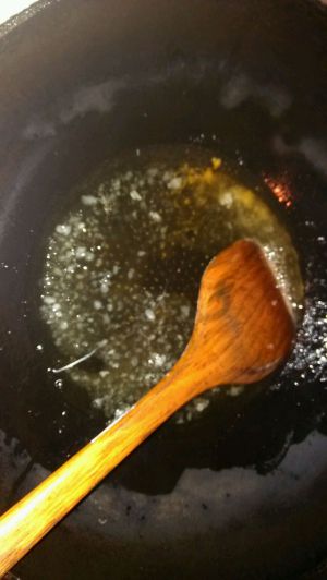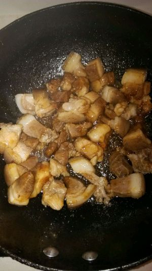 炒锅中放油放冰糖,这一步叫炒糖色,中火炒,炒制冰糖融化呈粘稠就可以了。