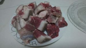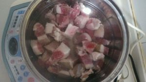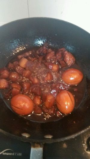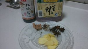 然后让入料酒,葱姜蒜,花椒大料桂皮一起翻炒,慢慢煸炒,大概十分钟,把肉里面的油脂都炒出来。然后让入热水,盖上锅盖小火炖煮半个小时即可。最后收干汤汁。