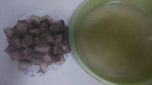 与冷水同时下锅,烧开,去浮沫,将肉捞出备用,保留肉汤