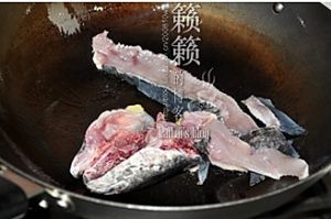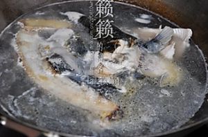 请超市或菜场鱼贩帮忙将鱼斩杀,将两大片净鱼肉起出,剔出鱼头、鱼尾、及鱼排等作为制汤材料。将斩杀后的鱼清理干净备用;锅烧热下油,油温稍起将生姜片投入锅中煸香,将除净鱼肉外的财鱼制汤部位下锅煎制;