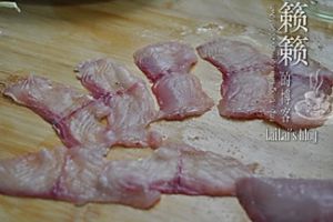 将鱼肉,斜刀片成大片,不要片得太薄,0.5CM左右厚度为好