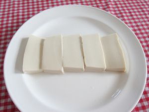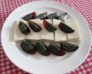 内酯豆腐切片,形状不要破坏。皮蛋切块摆盘。