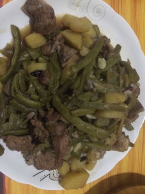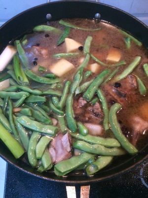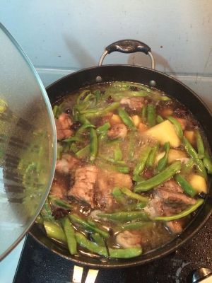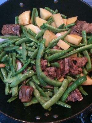 肉表面焦糖色,加入葱姜蒜,翻炒一会加入一大勺豆瓣酱炒香后,加入土豆和豆角翻炒