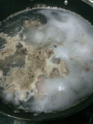 加一小勺鸡粉(鸡精)一点点盐(依个人口味)加入2小碗热水60以上的热水