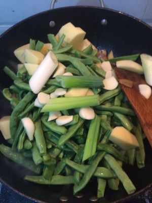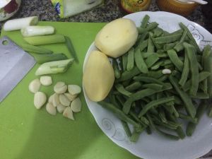 豆角去丝,土豆削皮,大葱切段,生姜切片,大蒜一刀两断