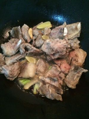 高压锅热锅凉油,加入糖,小火待微微冒烟糖融化变微黄加入肉,炒糖色