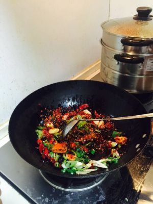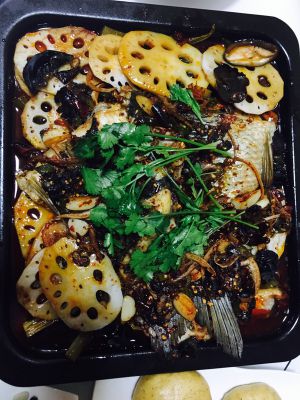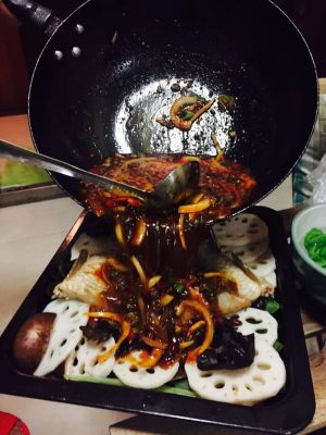 开始炒料底,料底根据个人口味添加咸淡辣椒!入油,偏多,加入葱姜蒜,干辣角,加入豆瓣酱,辣椒面,火锅底料适量,洋葱,翻炒,然后加入半碗水,水量鱼烤盘深浅匹配,保证底料倒入盘后不溢出能基本没过菜。底料水开后,调入花椒粉,鸡精等调料。然后淋在鱼上。将烤盘送入烤箱,200度,10分钟,烤盘内沸腾即可!