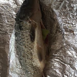鱼身表面刷一层油,鱼肚内塞葱段、姜片、蒜,放在刷了油的锡纸上。烤箱预热,170度20分钟。