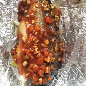 将炒好的豆豉酱均匀的淋在鱼上。再烤制5分钟后放在烤箱中下层再烤制15分钟以防鱼烤糊。