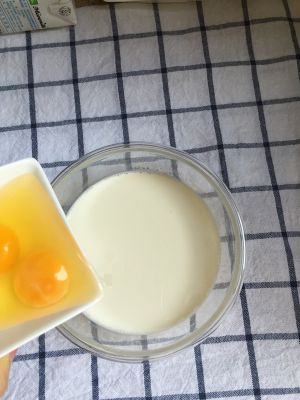 两个鸡蛋倒入牛奶中,并顺时针搅拌均匀