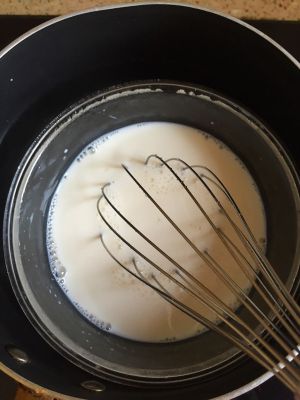 3.把鸡蛋跟奶油混合搅拌均匀,加入放凉了的牛奶里面搅拌均匀,(牛奶太烫的话会把鸡蛋烫熟,变蛋花)