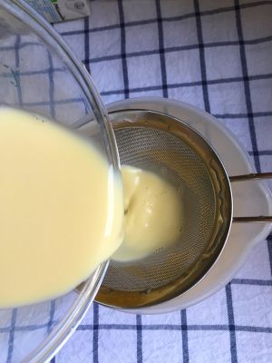 牛奶跟蛋液搅拌好后,过筛两次,过掉杂质和泡泡。然后放入预热好的烤箱165度。烤盘需要放水(水浴法)上下烤30-40分钟就可以了