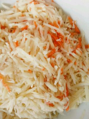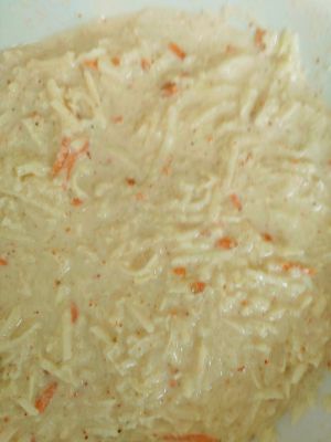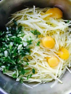 将土豆和胡萝卜擦丝,将葱沫放一起搅匀