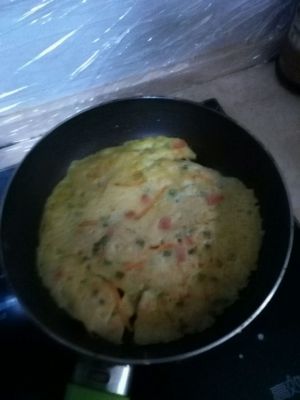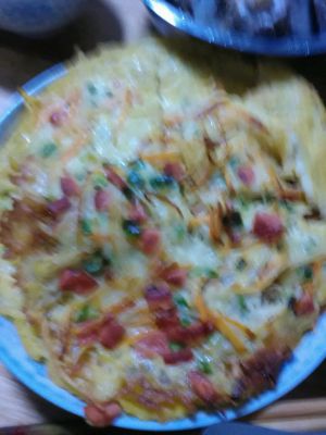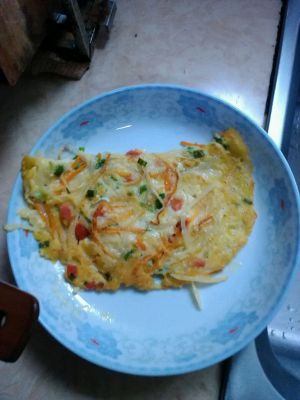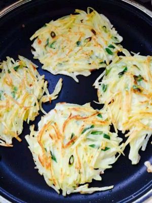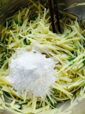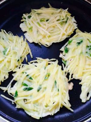将一个鸡蛋打入土豆丝中 ,在土豆丝中加入适当的盐,十三香,鸡精,香油,可根据自己的喜欢放一起辣椒面,搅拌均匀后,放入少于清水够加入淀粉进行搅拌(尽可能的多放一点淀粉)因为淀粉放少了在煎制过程中会散掉,搅拌均匀后热锅(平底锅)放油,一定要等锅热后在放土豆,将土豆摊匀