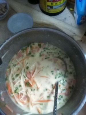 土豆,火腿肠,胡萝卜全部切丝,火腿肠切丁,香葱切末,加盐,加水,加面粉调制成面糊