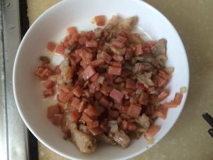 准备食材,豆切块 (建议切成小块熟的快 )放入蒸锅蒸熟,猪肉、火腿、洋葱切丁,鸡蛋打匀