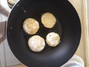 用土豆皮胚包裹肉馅 制成圆饼,沾取蛋液后 在粘取面粉