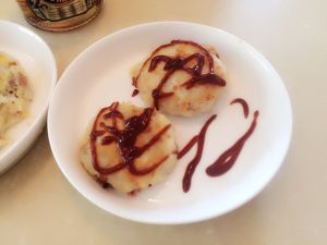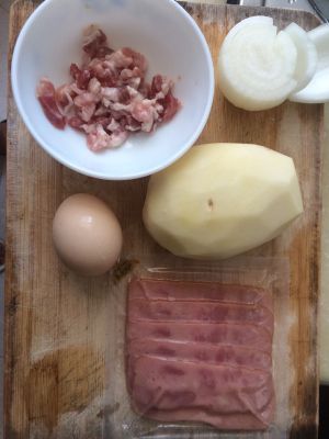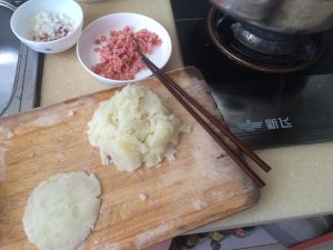 土豆蒸熟后,制成土豆泥 ,锅中加油 ,油热后放入洋葱爆香 ,后放入猪肉,加入少许盐、少许糖、少许酱油,后放入火腿 。出锅后加入少许香油拌均 做馅备用