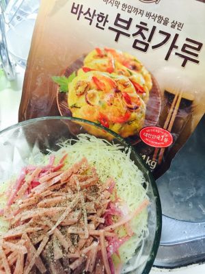 磨点黑胡椒碎~盐一点~鸡精一点~(这些调料不放也行~香肠放的多就会咸一点~肠儿放的少做出来淡了可以沾番茄酱吃哒~)然后撒点面~我用的是白雪油炸粉~普通面粉也可以哒~