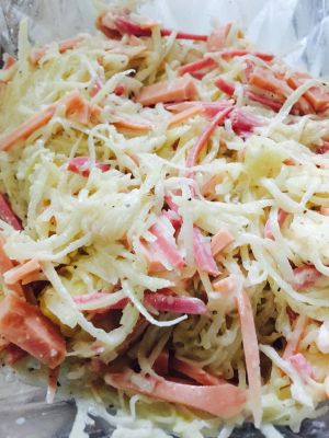 土豆切细丝、火腿肠切丁、加入面粉和适量水和成面糊糊