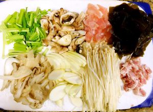 同上,准备好其余所有食材,图中从上到下依次为:小香芹,元蘑菇,鸡胸肉,海带,平菇,茭白,金针菇和五花肉。