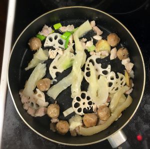 准备好牛肚,丸子和藕片。