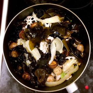 稍微翻炒一下,再放入珍珠菇,木耳和海带。