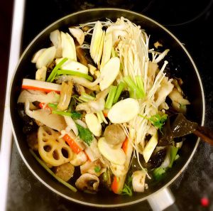 按照好不好熟的顺序下锅,先放相对不好熟的食材。这里先放了藕片丸子和牛肚。