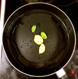 所有食材准备好以后,热锅添适量油,五成热时下葱姜。