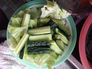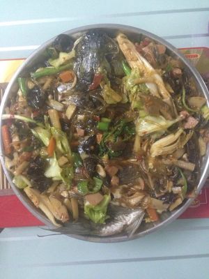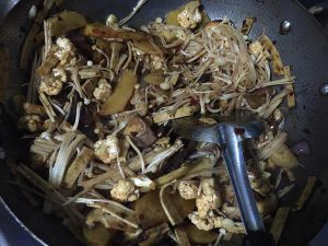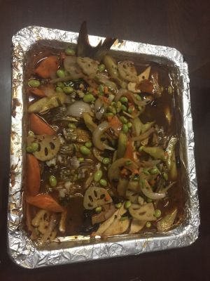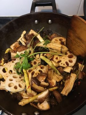 制作蔬菜:根据个人口味把各种蔬菜喜好切好,我选的有茭白片,藕片,土豆片,毛豆米,木耳,黄瓜条,胡萝卜片,香干(还可以用西芹,白干丝,腐竹等,个人口味随意搭配)!把油锅烧热放花椒八角香叶干辣椒煸香,再放置蔬菜下锅煸炒,放盐鸡精调味(也可以加老干妈辣酱),放水烧3-5分钟!