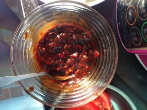 鱼烤了10分钟左右的时候,然后锅内放油,油热后放干辣椒,葱,姜,花椒炒香,炒出香味后加入郫县豆瓣酱炒出红油,火不能大,会焦