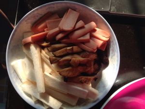 火腿杏鲍菇冬菇切片备用
