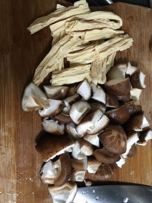 处理配菜:浸泡好的木耳腐竹洗干净,腐竹切条,香菇去根一分四,其实配菜可以如果自己喜好加,最好加的不要太多,我喜欢吃配菜多过鱼,加的有点多了