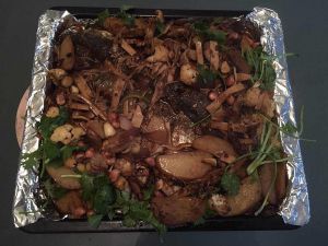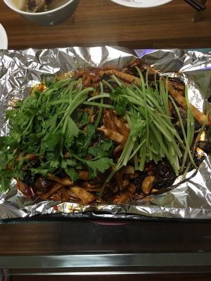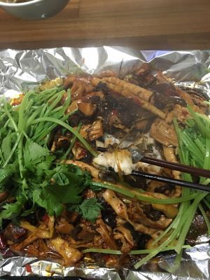 然后加水,吃饭小碗2碗。水开后放入配菜:木耳,笋尖,腐竹,香菇,藕片,加老抽,糖大火开后小火煮下,煮个10分钟正好浇在鱼身上,香芹这个时候也可以放上去(我是一半烤的时候放进去,还有一半拿出来的时候当香菜一样洒上去的)其实这个配菜可以按自己个人喜好放 我这个配菜太多了……外面烤鱼店建议放3种