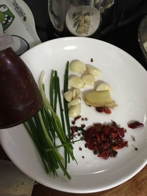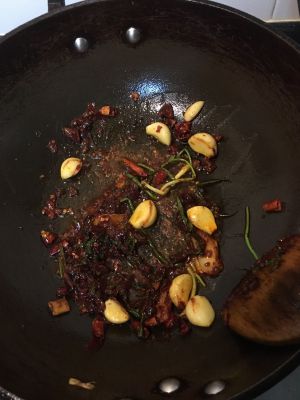 准备炒配菜的料:大蒜,最后那点葱姜全部炒掉,干辣椒,花椒,郫县豆瓣酱。觉得不够辣,可以放点剁椒呀啥的