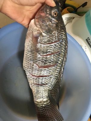 罗非鱼洗干净用刀把鱼一分二,全分开的。就一个人吃所以我就做了一半,大家可以放整条趴着,鱼头这里可以不要完全切断。烤的时候整条鱼片趴着烤。
