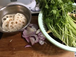 藕片切片浸在盐水里,不然会发黑,洋葱切好,,笋尖洗好备用,香芹是鱼要烤好的时候放在鱼身上微烤一下,要不然就瘪了