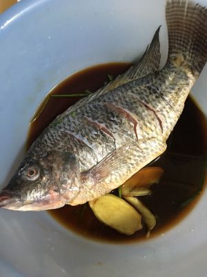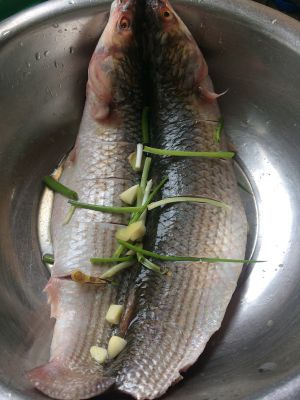 鱼用盐擦下全身入味,姜葱(放三分之一的葱和姜),料酒,生抽浸泡30分钟左右,时间久一点会更入味
