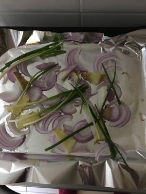 烤箱预热,烤盘上这样铺好,前面不是留着的姜葱么,这时盘子放一半,最后的一点葱姜要炒配菜用