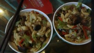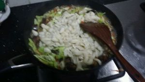 放入猫耳朵炒匀。加入泡野山菌的水焖煮。