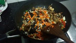 依次放入姜蒜葱白野山菌红萝卜丝虾皮瘦肉炒匀。