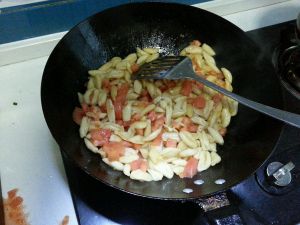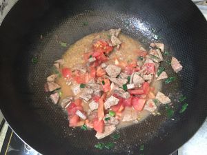 把番茄下锅,炒均匀,要不停的翻炒,防止番茄的水分导致面点粘锅导致焦锅,翻炒吧!加油,炒到番茄熟后在下步骤