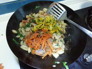加入胡萝卜和油菜,胡萝卜炒软后,加盐和酱油调味,然后加入猫耳朵翻遍均匀。