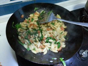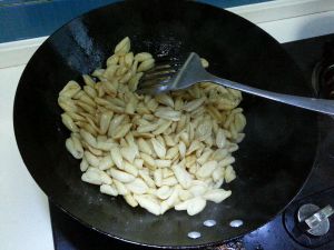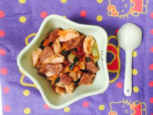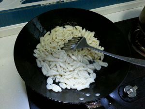 锅下油,下猫耳朵,翻炒,看见猫耳朵滑溜溜的乱跑哦!