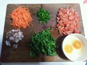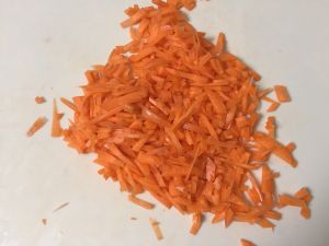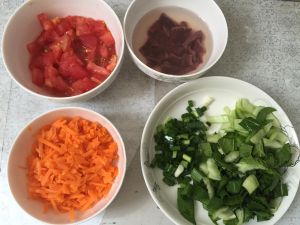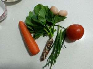 胡萝卜用萝卜刨子刨丝,那样粗细均匀,香葱切碎,番茄切成小粒,香肠切片,青菜切碎,备用