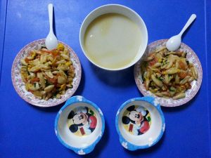 炒猫耳朵,这是给家里俩小爷的晚餐,还配了鲫鱼汤,美味又营养