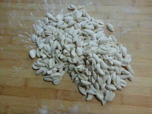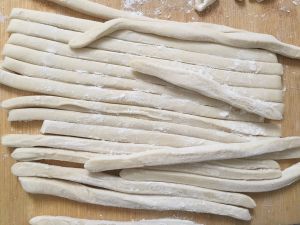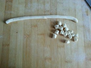 把揉好的面粉切成许多条,然后搓成长条,切出小粒备用,注意不能切太大粒哦!小小的猫耳才可爱,因为面点熟了会膨胀会变大