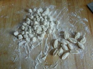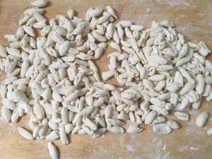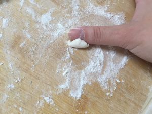 把切好的小粒加少许面粉防粘,用大拇指来推出小猫耳的形状,一次一颗,熟能生巧