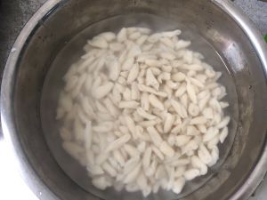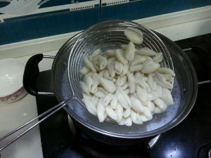 汤锅烧水,水烧开后放入猫耳朵,煮熟后捞到提前放了凉水的盆里。